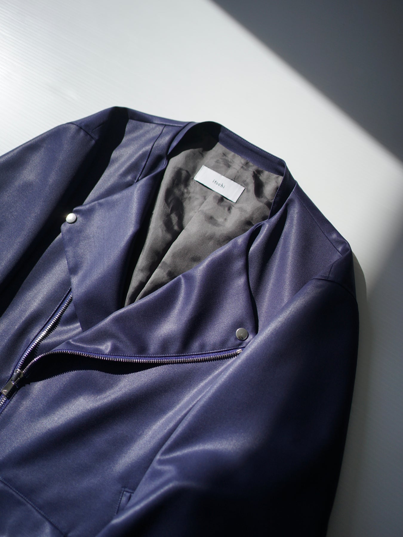 上衿やベルトなどのディテールを省略、「ライダースジャケットである」と認識する限界までミニマルにし、その生地に注視してしまうようなバランスで構築しました。